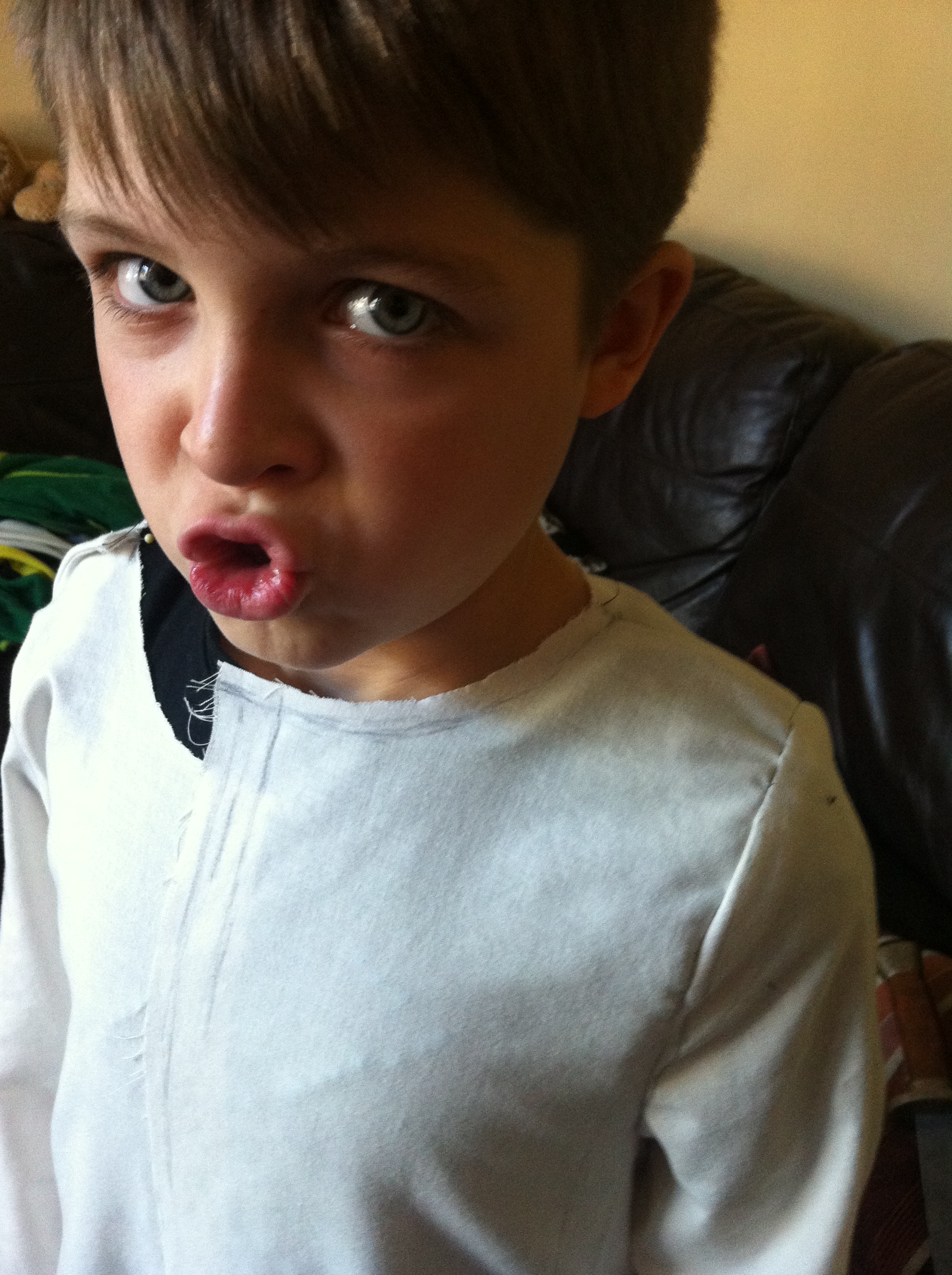I drew round him on some card and started to make the basic shape. I then add my seam allowance and cut it out of calico. With a slight adjustment to the neck line and winging it with the bell sleeves I got to work! It took a little bit of time as I was making it up as I went along. I have never made or sewn a sleeve before but watched a few YouTube videos to help me along.